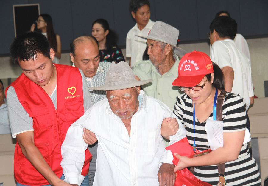 志愿者攙扶抗戰(zhàn)老兵進(jìn)入會(huì)場