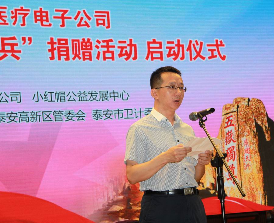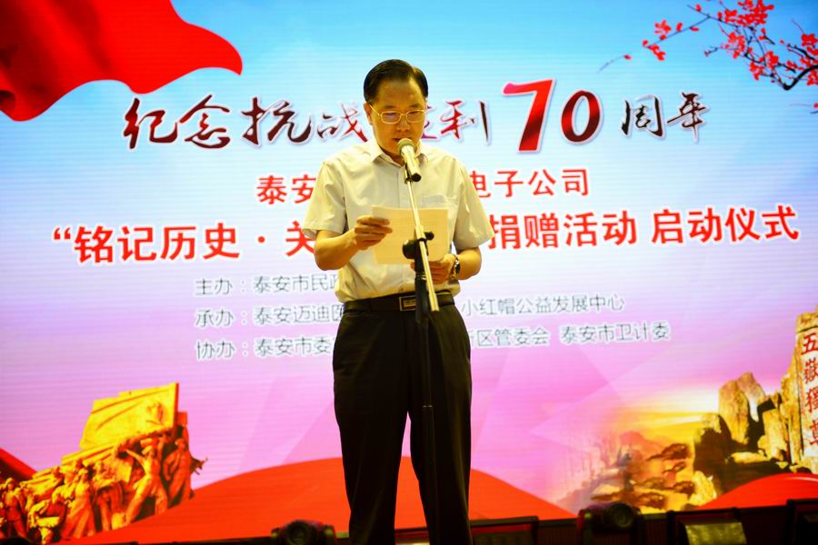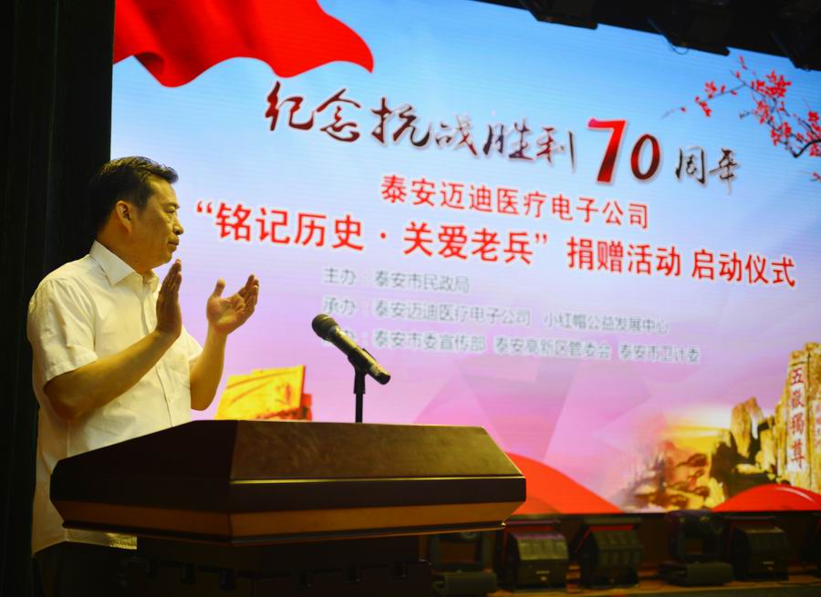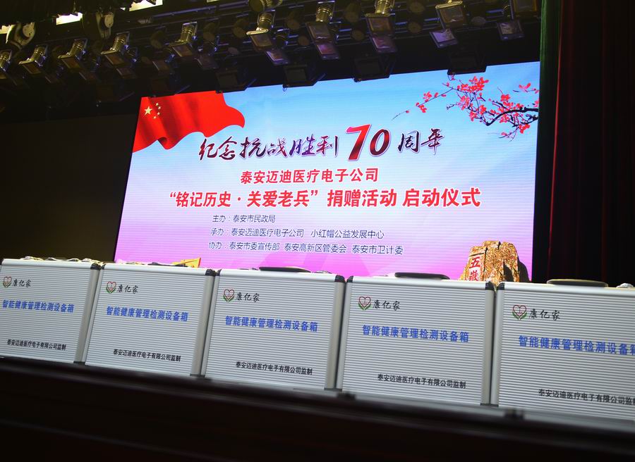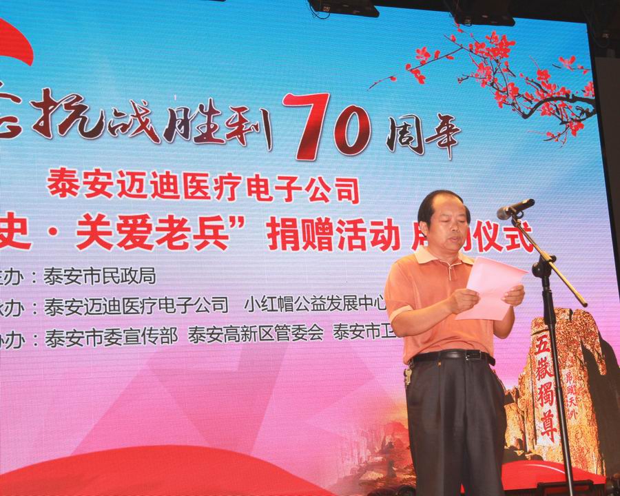 為紀(jì)念抗日戰(zhàn)爭暨世界反法西斯戰(zhàn)爭勝利70周年,弘揚(yáng)抗戰(zhàn)精神,褒揚(yáng)抗戰(zhàn)老戰(zhàn)士,泰安市邁迪醫(yī)療電子有限公司發(fā)展不忘回報(bào)社會(huì),在泰安市民政局的指導(dǎo)下,拿出遠(yuǎn)程家庭健康檢測產(chǎn)品,為抗戰(zhàn)老兵送愛心、送健康。 2015年8月24日,在泰安市傳媒集團(tuán)演播大廳,泰安邁迪公司紀(jì)念抗戰(zhàn)勝利70周年“銘記歷史·關(guān)愛老兵”捐贈(zèng)活動(dòng)啟動(dòng)儀式,在溫暖、熱烈的氣氛下進(jìn)行。泰安市副市長徐恩虎、泰安市民政局局長孫蘭俊、副局長董峰、泰安邁迪公司董事長范世忠、泰安市小紅帽公益發(fā)展中心主任張煥慶,以及縣市區(qū)、景區(qū)優(yōu)撫單位代表、社會(huì)愛心人士和廣大志愿者200余人參加。市委副秘書長于文龍主持儀式。