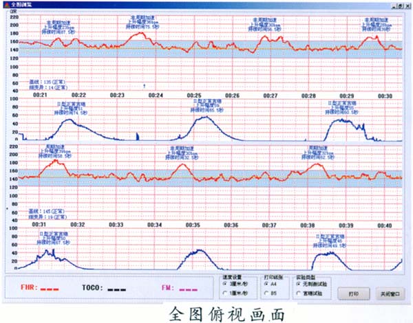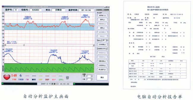 在監(jiān)護(hù)中對(duì)胎心率基線、細(xì)變異大小、加速、各種減速及胎動(dòng)的變化進(jìn)行實(shí)時(shí)在線分析,并將分析結(jié)果顯示在屏幕上,監(jiān)護(hù)結(jié)束時(shí)對(duì)所有的監(jiān)護(hù)信息進(jìn)行綜合分析,給出監(jiān)護(hù)診斷結(jié)果及胎兒評(píng)分供臨床參考,使得每個(gè)婦產(chǎn)科大夫都能輕松進(jìn)行胎兒監(jiān)護(hù)圖形分析和診斷。
